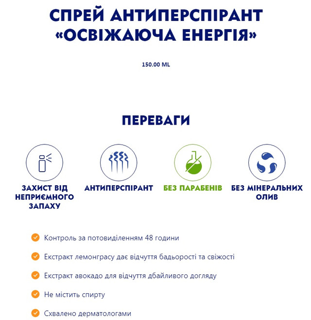 дезодорант дерматологічно протестований, не містить етилового спирту. Він підходить для всіх типів шкіри, швидко висихає, не залишає слідів на одязі. Насолоджуйтеся звичним активним способом життя і почуваєтеся впевнено!